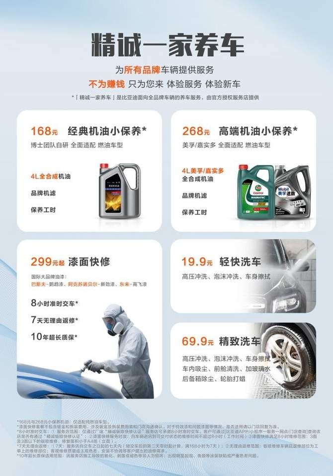 去年7月,比亚迪售后率先推出“精诚一家”活动,4年以上合资车主认证试驾即可享99元或199元的全合成机油小保养,已吸引超六位数车主“薅羊毛”。活动仍在进行,车主可通过比亚迪APP或小程序参与。