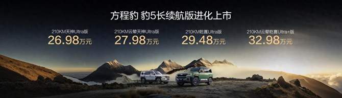 10月20日,方程豹汽车“豹5长续航版”焕新上市,价格26.98-32.98万元;豹8大五座版加推上市,价格37.98-40.78万元。方程豹以“人人可野·拥豹新生活”为核心主张,以豹5的10万台销量达成,以及品牌的20万台销量达成,宣告着电驱越野时代的全面到来。豹5持续蝉联硬派越野销量冠军,登顶“越野新王”,豹8则以引领40万级高端新能源SUV的姿态成为比亚迪华为联手打造的“稀缺旗舰”。本次方程豹豹系列产品,实现了DMO平台的DMO+升级、华为乾崑智驾的ADS 4升级、以及比亚迪智慧生态等多项顶级核心科技的全面升级,在续航、安全、舒适、操控等全维度提升,为更多用户带来系统性升级新选择。