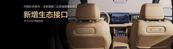 豹5长续航版、豹8大五座版上市即搭载钛7同款比亚迪智慧生态,通过生态设备的“全能管家”比亚迪智慧物联APP,无需复杂操作,也不需要手动连接多个设备,语音指令即能控制全车所有的生态产品。此外,两款新车型的前排座椅背后均加装了生态接口,插入转轴支架后,可以搭配BYD Pad使用。未来将有更多的生态产品,通过生态接口提供用户以智慧互联的无限体验。