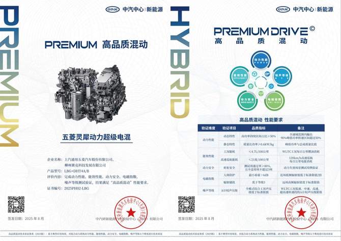(“中汽中心高品质混动认证”证书)