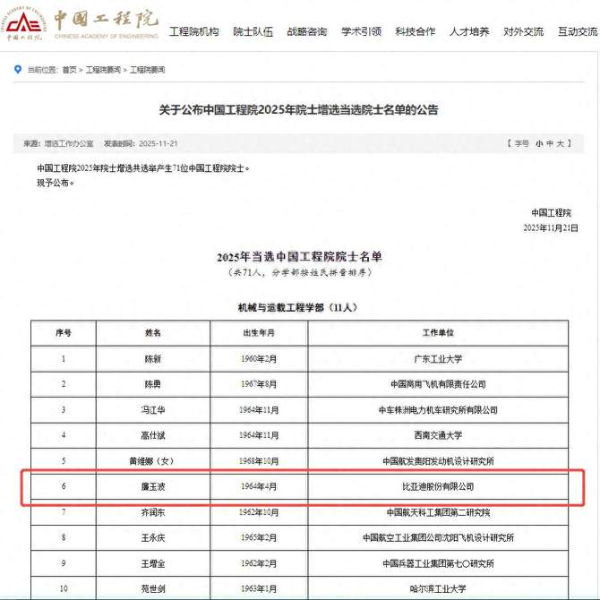 2025年11月21日,中国工程院公布了2025年院士增选结果。比亚迪集团首席科学家、汽车总工程师、汽车工程研究院院长廉玉波当选中国工程院院士,技术先锋实至名归。院士是我国科学技术方面和工程科技领域的最高荣誉称号。廉玉波长期致力于新能源汽车关键系统及整车研发工作,取得一系列核心技术突破。此次当选中国工程院院士,既是对其个人成就的认可,更充分体现了比亚迪“技术为王,创新为本”的发展理念。未来,比亚迪将继续秉持工程师文化,不断突破新能源汽车技术新高峰,为推动中国汽车产业高质量发展贡献更大力量。