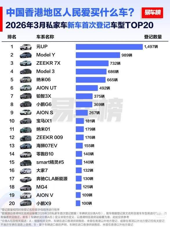 2026年伊始,比亚迪在香港市场捷报频传。易车榜数据显示,3月,比亚迪以1763辆的成绩登顶香港汽车市场全品牌销量榜首,其中元UP单车贡献1497辆,成为当月最畅销车型。