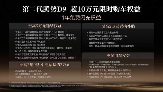 为感恩新老用户的支持和信赖,即日下订第二代腾势D9,可享至高价值超10万元限时购车权益!包含12个月免费闪充权益以及2年0息或3年低息等金融方案。此外,本次置换权益诚意十足:腾势车主可以享受2万元的置换补贴,比亚迪或者奔驰车主可以享受1.5万元的置换补贴,其他品牌车主也可以享受1万元的置换补贴。