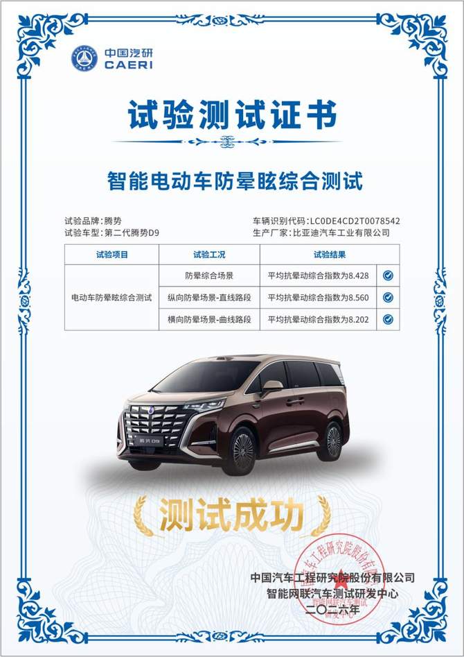 再搭载定眩智能防晕车系统,通过感官多维干预,彻底告别晕车困扰,让全家出行更舒适。第二代腾势D9防晕车功能处于行业领先水平,已通过专业机构权威认证。