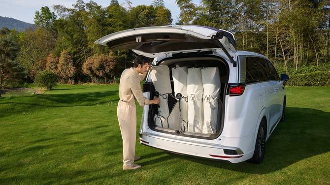 同时后备厢新增126L下沉式储物空间,能放下1整个高尔夫球包;后备厢整体容积达882L,是混动豪华MPV中最大的后备厢。即便7人舒适满座,也可以并排放下4个高尔夫球包或12个行李箱。全家集体出行、商务差旅收纳需求一站式满足,彻底告别满员出行行李放不下的尴尬。