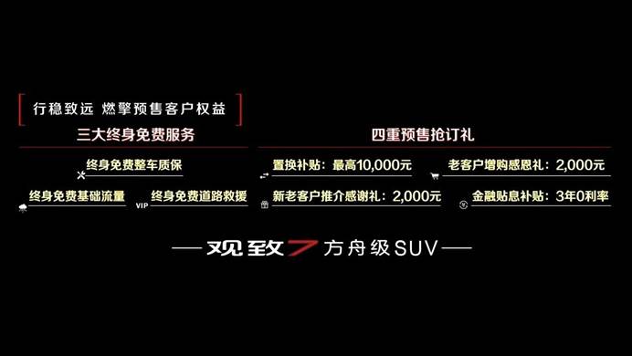 与此同时,观致7还相当有诚意的推出了三大终身免费服务及四重预售抢订礼。