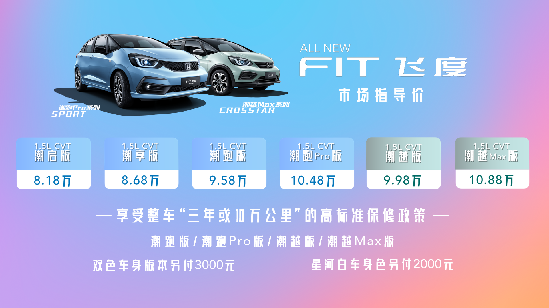 第四代飞度的潮跑Pro(SPORT)系列和潮越Max(CROSSTAR)系列携手炸裂登场,炫酷拉风,潮酷气质惊艳了上市会所有人的目光。其中SPORT潮跑Pro系列市场指导价为8.18万元-10.48万元,CROSSTAR潮越Max系列市场指导价为9.98万元-10.88万元,同时,新车享受整车“三年或10万公里”的高标准保修政策,欢迎前往河南郑州区域各特约店品鉴垂询。