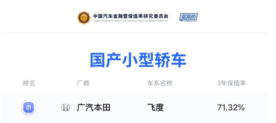 飞度(FIT)荣获国产小型轿车保值率榜单No.1
