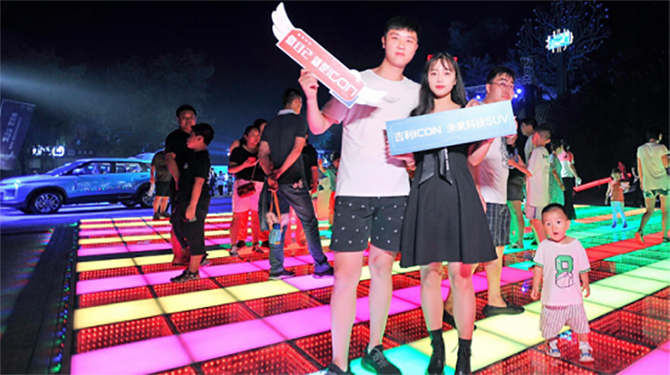 活动现场吉利ICON以酷炫、时尚、科技、未来,与年轻消费者直接对话,在多彩的光影变换中,吸引了大量的游客参与,来到现场体验ICON的时尚与科技,感受光影魅力;