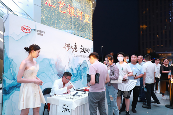“汉”、“唐”作为比亚迪品牌旗舰车型,发布会现场设置也无不彰显出“盛唐强汉”的气势与底蕴:汉、唐主题天幕,引来客户的驻足观看;国潮民乐演绎古风今韵;汉唐书法画扇DIY引发互动热潮;