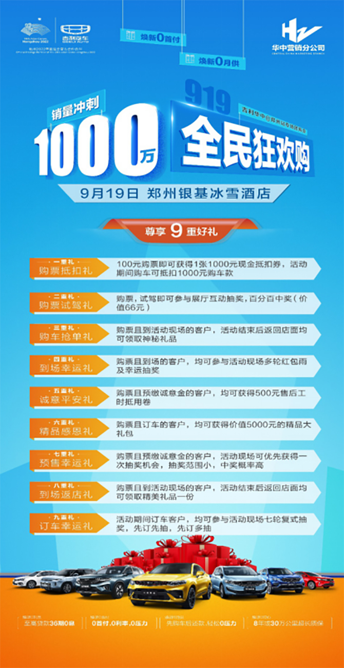 为了迎来即将到来的,第1000万辆的历史性突破,吉利华中营销分公司在9月19日将举办销量冲刺1000万全民狂欢购吉利华中郑州站专场团购会!