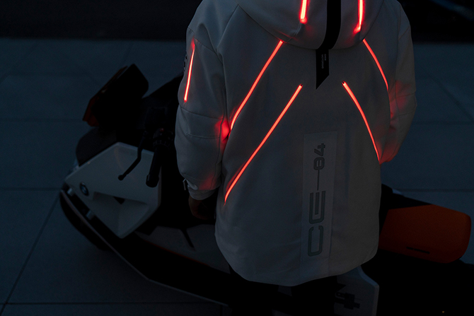 与BMW Motorrad Definition CE 04概念车配套研发的骑行服更像是一件时尚风衣,可与骑行牛仔裤、运动鞋和颇具都市风格的半盔搭配,展示出骑士的潮酷态度。高耸的衣领、宽大的披风、巧妙的拉链位置、若隐若现的印花设计均令骑行者更显前卫。这款前所未有的骑行服以高科技材料剪裁而成,防水、坚固、透气性佳。搭配宽松的版型设计,骑士穿着舒适度更高。