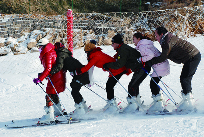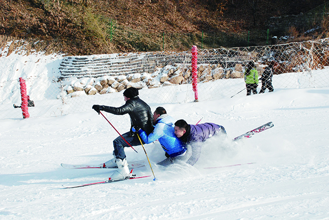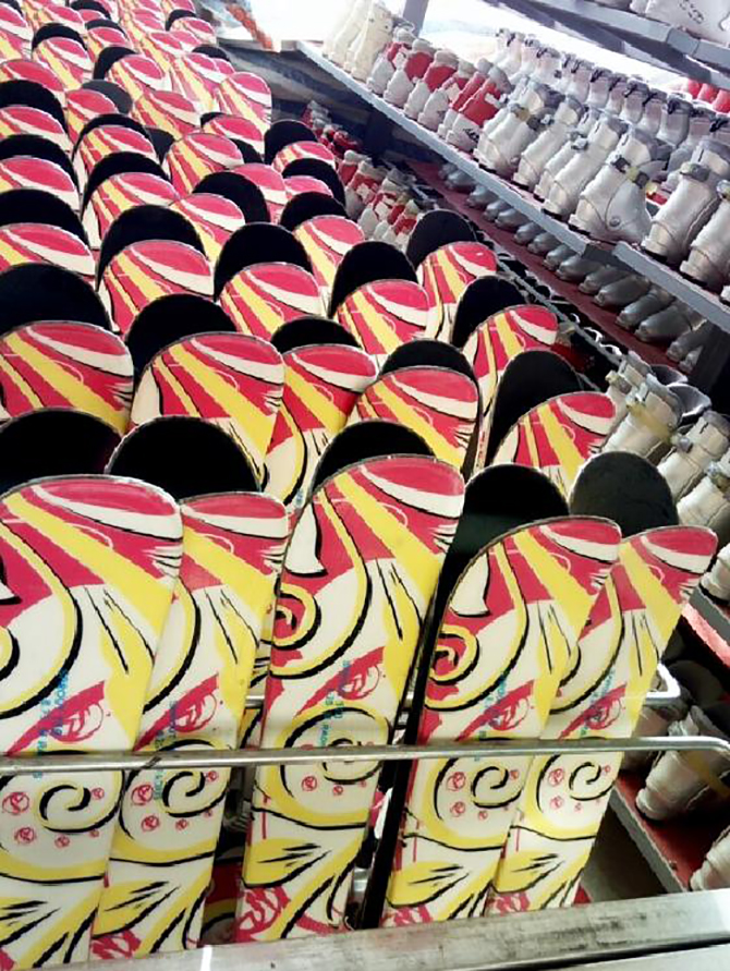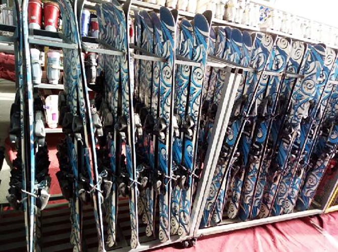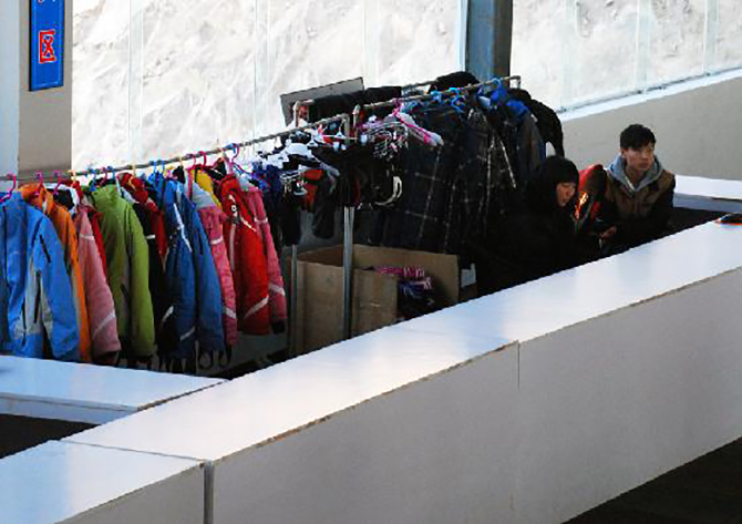 然后到雪具大厅选择需要的道具,交付完租用道具的押金,正确穿戴好滑雪鞋,才算真正开始滑雪之旅。