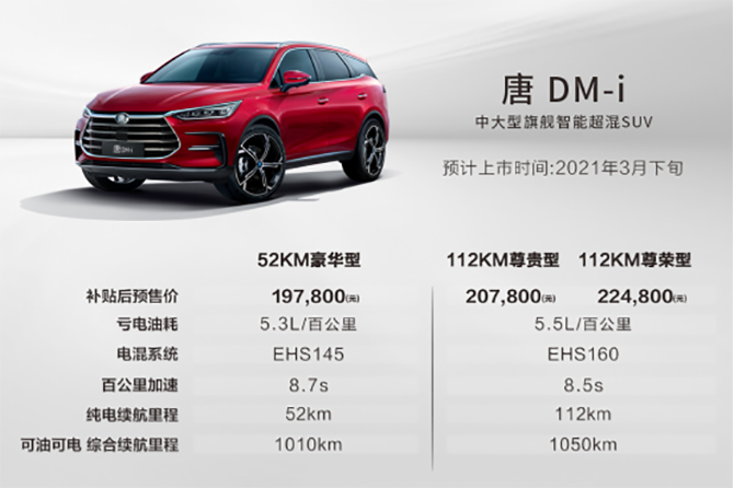 1月11日,DM-i超级混动正式发布,同时,备受关注的中大型旗舰智能超混SUV唐DM-i也正式亮相并开启预售,新车拥有52km和112km两个纯电续航版本,补贴后预售价52KM豪华型19.78万元,112KM尊贵型20.78万元,112KM尊荣型22.48万元。
