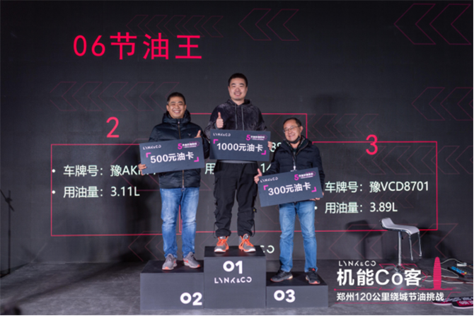 1月10日,郑州近百名领克车主朋友齐聚G30连霍高速郑州服务区,共同挑战5升油行驶120公里环绕郑州,领克06的车主们纷纷邀请自己朋友共同参与活动,在见证挑战的同时,分享领克06领克的先锋品质和愉悦的机能体验。根据挑战规则,车主驾驶自己的领克06从G30连霍高速郑州服务区满油出发,环绕郑州绕城高速,实际行驶105公里后再次返回服务区加油计算实际油耗,经过一番角逐,三名车主分别以实际用油3.89L、3.11L、2.14L的成绩获得领克06节油王的称号。同时还有13名车主用油在5L以内挑战成功。本次活动中,领克03+的车主也参与其中为领克家族的新晋成员领克06站脚助威,最终03+节油王的挑战成绩为4.72升,展示了领克03+要性能也要省油的不俗实力。
