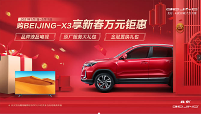 2021年1月1日到2月11日期间,凡是购买BEIJING-X3车型(入门价格低至4.99万)并注册智惠管家APP,就能获得万元大礼包,包括:43寸品牌液晶电视、全车太阳膜、底盘装甲及动力总成10年30万公里质保。除此之外,贷款购车还能享受最高5000元的贴息,可谓是性价比十足,非常适合近期有购买入门家用代步工具需求的消费者。