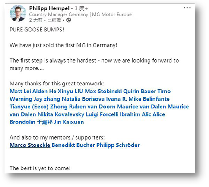 作为现代汽车工业的诞生地和领头羊,德国长久以来一直是汽车研发及制造的“天花板”。德系品质受到全世界用户的认可,也是德国人的第一选择,据调查德国购买其“自主”品牌的用户占比超过70%。上汽乘用车攻入德国的背后,实质是中国汽车自主品牌凭借在国内市场快速发展的经验,实现在欧洲市场与当地品牌直接竞争。作为中国最大车企的自主品牌,上汽乘用车现已自主掌握了新能源、智能网联领域的多项核心科技,并不断将技术优势转化为产品优势。以MG EZS为例,这款车不仅满足欧洲严苛的排放标准,还获得Euro NCAP五星安全评价、通过REACH环保标准。