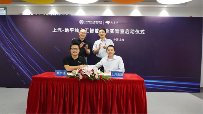 上汽集团副总裁、上汽乘用车总经理杨晓东(右一)和地平线创始人兼CEO余凯(左一)签署战略合作协议