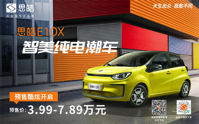 自预售开启以来,思皓E10X以天生出众的气质,同级最丰富的续航组合、最实用的空间及配置,在A00及纯电动车市场上脱颖而出,成为广大潮流青年的首选车型。目前,思皓E10X新车终端已陆续到店,做最潮的时尚达人,开最潮的时尚单品,思皓E10X与您一起潮范上线!