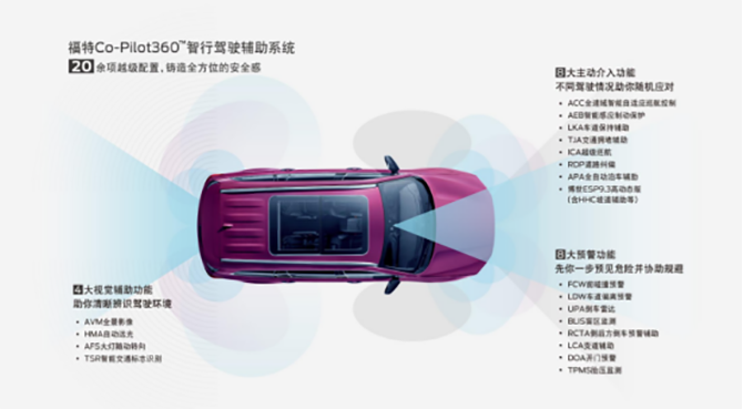 福特领裕搭载多达20余项智能驾驶辅助技术的福特Co-Pilot360™智行辅助驾驶系统,全车拥有20余个传感器,搭载数枚高效能车载处理芯片。实现前向/后向/侧向/停车全覆盖,为家庭成员提供最全面的守护。