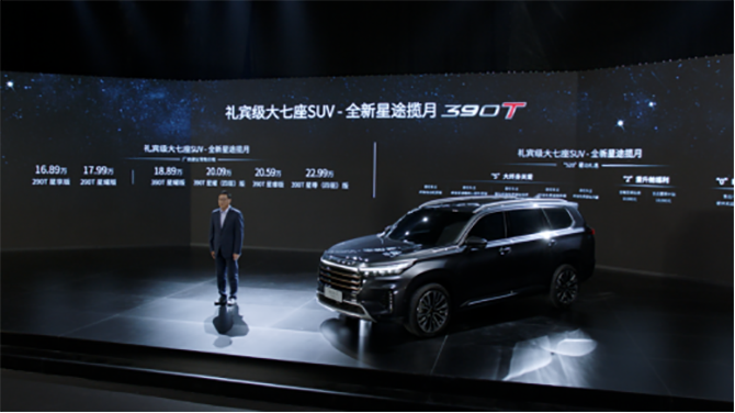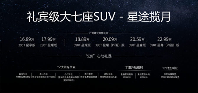 3月18日,备受瞩目的大七座礼宾级SUV星途揽月通过线上直播的方式,正式宣告产品上市,新车售价16.89-22.99万元。本次发布的星途揽月一共有6个版型,分别是搭载了2.0T动力的390T车型,包括星耀版、星耀版(四驱)、星睿版和星尊版(四驱),以及搭载1.6T动力的290T车型,包括星享版和星耀版。
