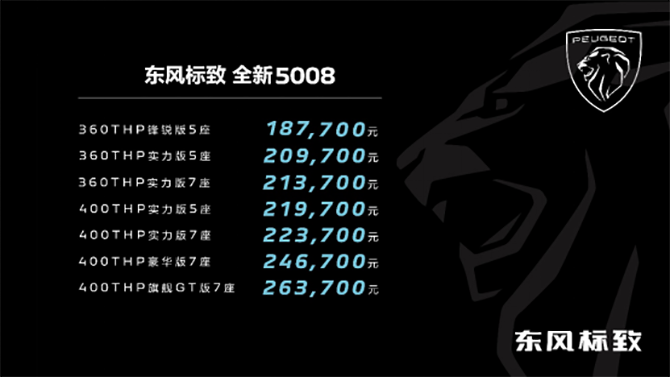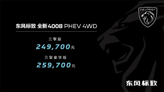 东风标致新法式SUV家族三款车型,新法式臻品SUV全新4008&新法式高性能混动SUV全新4008 PHEV 4WD&新法式旗舰SUV全新5008官方指导价分别为,全新4008车型169,700元-233,700元;全新4008 PHEV 4WD车型249,700元-259,700元;全新5008车型187,700元-263,700元。