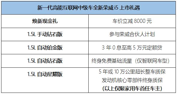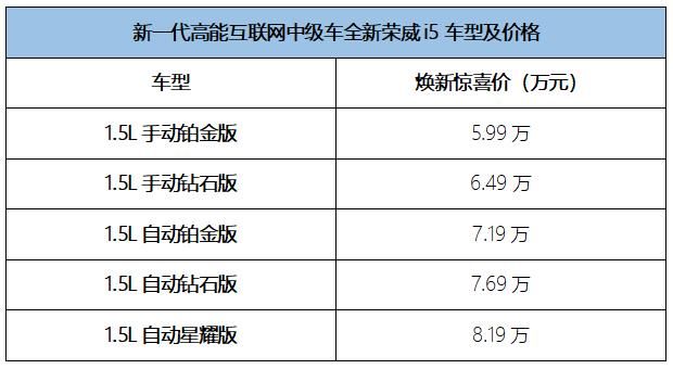 4月30日晚19:00,上汽荣威新一代高能互联网中级车全新荣威i5华中区上市会在郑州举行,全系共推出5款1.5L车型,官方指导价6.79-8.99万元,焕新安心礼5大惊喜豪礼,焕新惊喜价5.99-8.19万元!