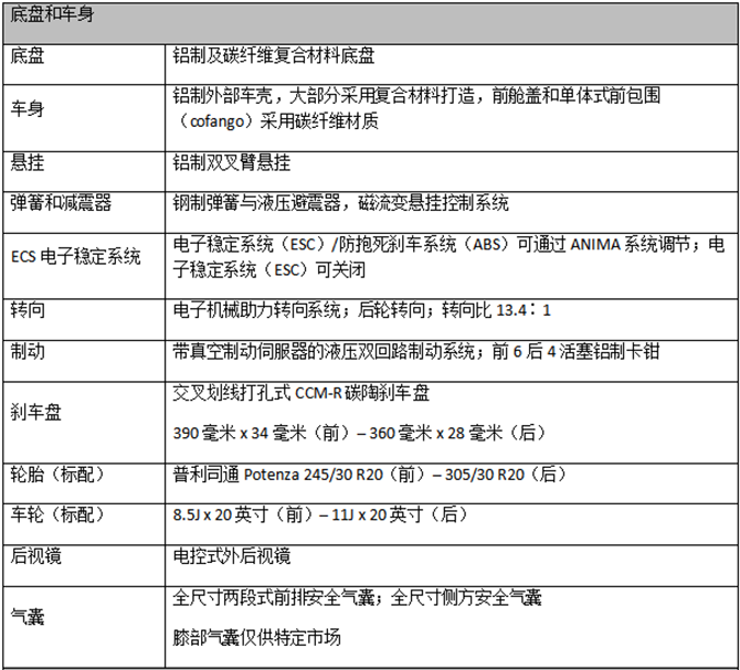 动力高达640马力,在6,500转/分时扭矩可达565牛·米,重量功率比为2.09千克/马力,从静止加速至100公里/小时仅需3秒,100公里/小时的制动距离仅为30米,200公里/小时的制动距离仅为110米,动态节奏和操控性专为刷新圈速纪录而生