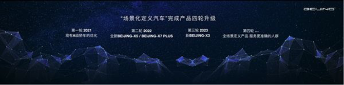 在车展现场,北京汽车明确未来三年,将通过四轮产品升级,实现“场景化定义汽车”。其首轮升级是现有A级轿车的优化,也就是近期即将推出的北京EU5 PLUS和北京U5 PLUS两大改款产品;第二轮是1/4场景化的全新北京X5和北京X7 PLUS,前者是为85后正在奋进的人群打造的A级SUV,而后者则是专为事业有成、家庭美满的新城市中产打造的一款中大型SUV;第三轮是1/2场景化的新北京X3,是为Z世代后浪打造的一款小型SUV;第四轮将是全场景化产品,所谓全场景化是指,北京汽车的产品将会服务更准确的人群,形成更独特的电动车解决方案,并将为用户提供个性化的全场景用车体验。