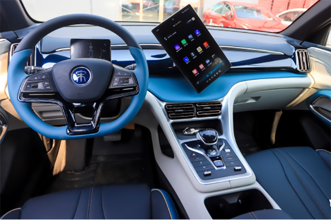 相比外观,第二代宋Rro的内饰有了更大的变化和提升,内饰设计上配备熟悉的可旋转中控屏,整体显得简洁、清爽,能带来更舒适的体验。内饰使用的是古韵灵感的双份配色,分别为釉玉蓝和麒麟棕,两种双色内饰让视觉效果变得更加出色。