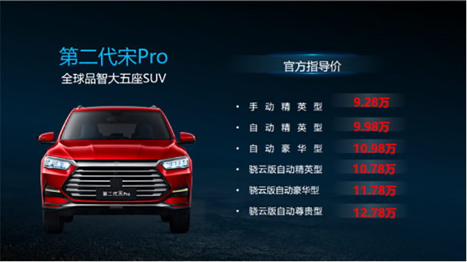 在现场众嘉宾的期待下,比亚迪汽车河南文华店产品经理张文林为大家公布了第二代宋Pro的上市价格及优惠政策。第二代宋Pro共发布了6款车型,官方指导价为9.28万-12.78万。