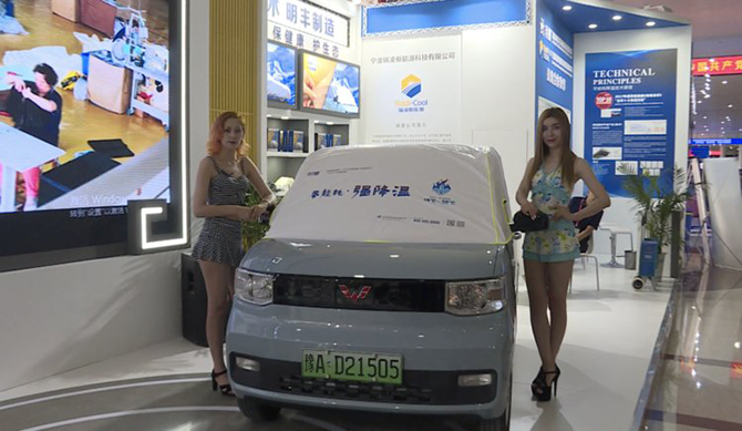 浙江明丰实业股份有限公司董事长沈中明说:“我们这次有了一个全球领先,零能耗降温的新材料产品,主要功能是夏天可以挡阳隔热,冬天可以防冻挡雪,主要采用的是强降温技术新材料生产出来的一种布料,做成的一个挡阳系列产品。”