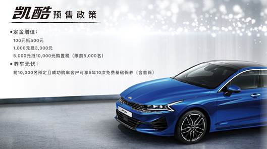 与此同时,凯酷预售正式开启。即日起通过东风悦达起亚天猫官方旗舰店参与预订,小订和中订客户可以分别享受到100元抵500元、1,000元抵3,000元的福利,前5,000名大订客户将能够享受5,000元抵10,000元购置税的超值福利。同时,前10,000名预订且成功购车客户还可获得5年10次免费基础保养(含首保)的养车无忧礼包。