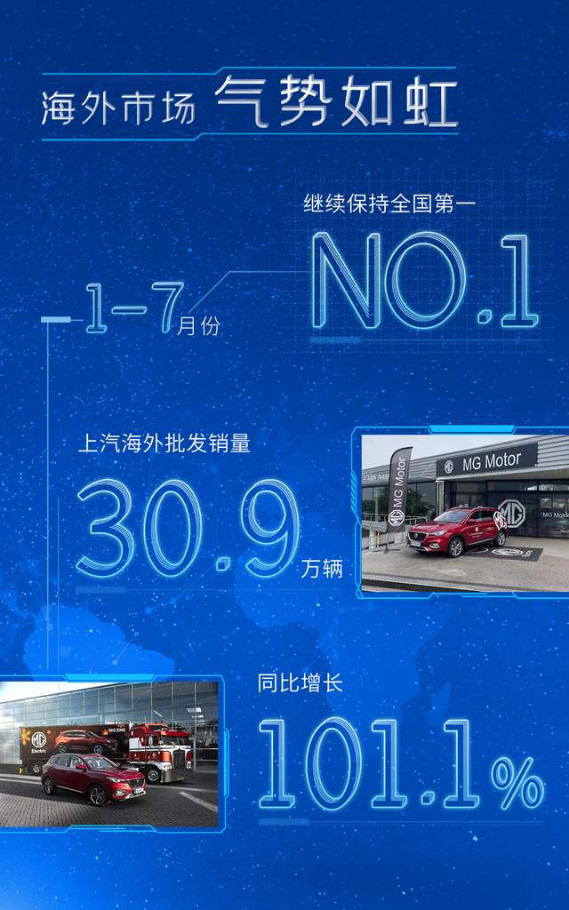 海外市场表现“气势如虹”。7月份,上汽在海外市场批发销量达5.1万辆,同比翻番。其中,MG品牌海外销量超过2.6万辆,同比增长80.1%,长期保持中国单一品牌海外销量冠军;Maxus品牌海外销量近0.5万辆,同比增长130%。特别是在欧洲、澳新等发达国家市场, MG品牌7月份销量超过0.8万辆,在自身海外总销量中的占比超过三成。今年1-7月份,上汽海外批发销量达30.9万辆,同比增长101.1%,继续保持全国第一。
