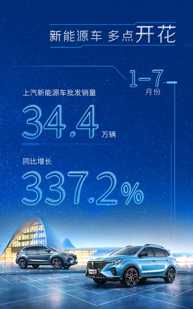 新能源车“多点开花”。7月份上汽实现新能源汽车批售4.8万辆,同比增长138.1%。其中,上汽乘用车公司荣威、MG、R汽车合计销售新能源车超过1.3万辆,同比增长219.4%,连续五个月销量破万;上汽大众销售新能源车近0.4万辆,同比增长80.4%,“ID电动家族”销量环比增长51.9%;上汽通用五菱五菱和宝骏品牌销售新能源车超过2.7万辆,同比增长135.2%。今年1-7月份,上汽新能源车批发销量达34.4万辆,同比增长337.2%,稳居国内新能源汽车销量冠军。