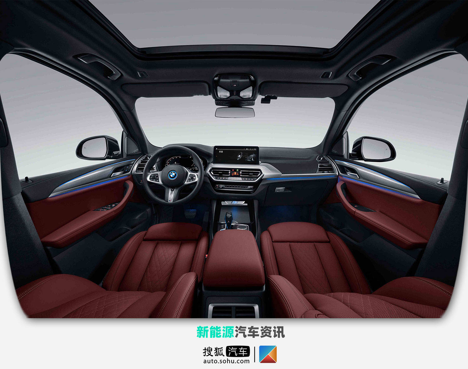内饰部分,新款宝马 iX3 配备了 12.3 英寸中央触控显示屏,内饰皮革升级为 Sensatec 2.0 合成皮包裹。
