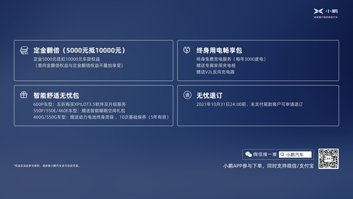 在购车权益方面,于2021年9月15日-2021年10月31日期间购买小鹏P5的用户,将享有上市活动期权益。活动期内支付定金并完成合同签署,可享受定金5,000元抵扣10,000元购车尾款权益、终身用电畅享包、智能舒适无忧包(权益及活动参与规则,请参考小鹏汽车官方活动页面)。