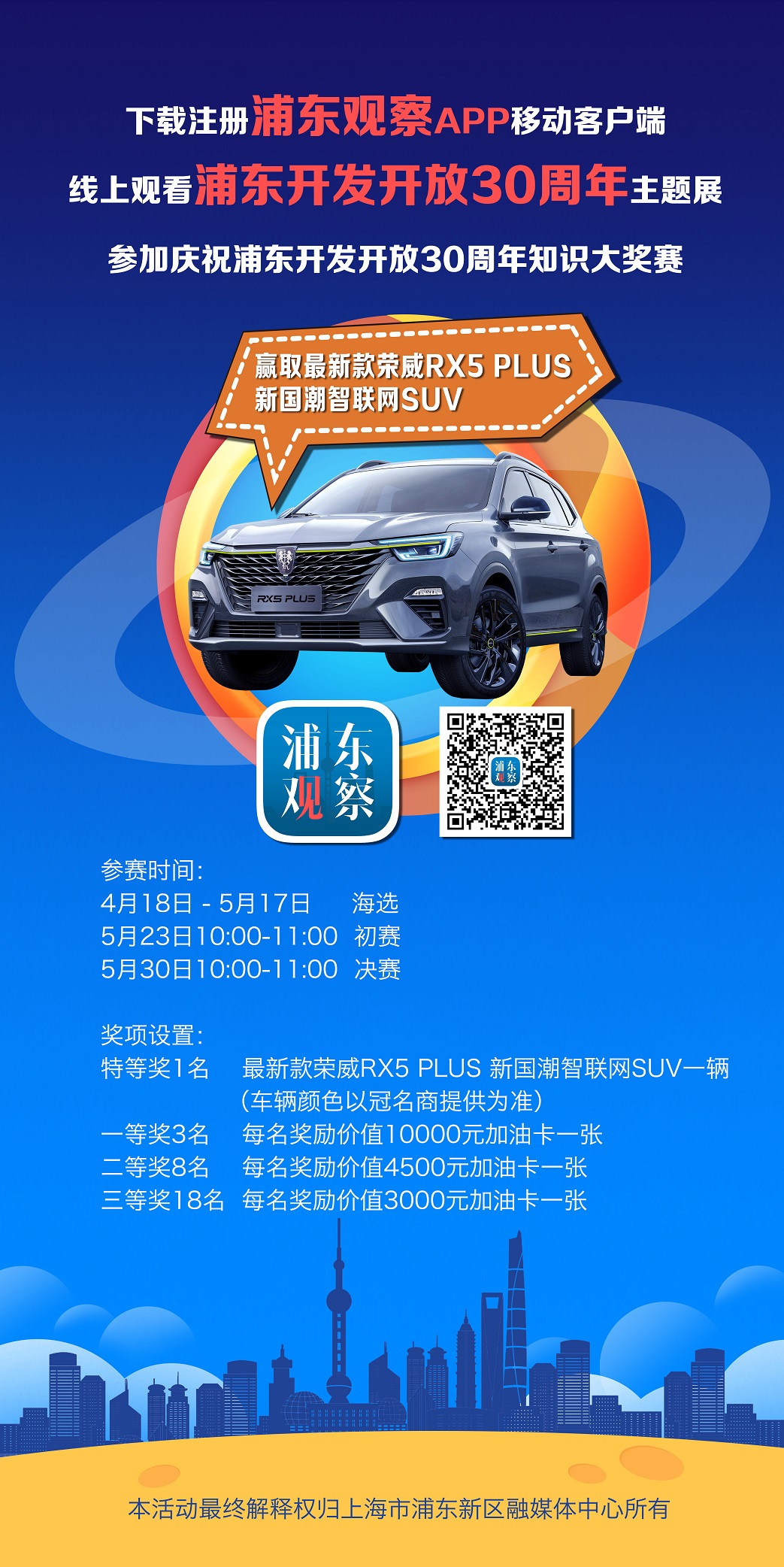 近日,浦东新区举办“在国家战略的伟大旗帜下”浦东开发开放30周年线上主题展,并通过浦东观察APP推出知识大奖赛。浦东30年,荣我国威路,上汽荣威自成立以来和浦东共同发展。为庆祝浦东开发开放30周年,上汽荣威助力知识大奖赛,4月18日起,参与者答题即有机会获得荣威品牌焕新形象以来首款力作新国潮智联网SUV荣威RX5 PLUS一辆,还有万元加油卡等奖品等你赢取!