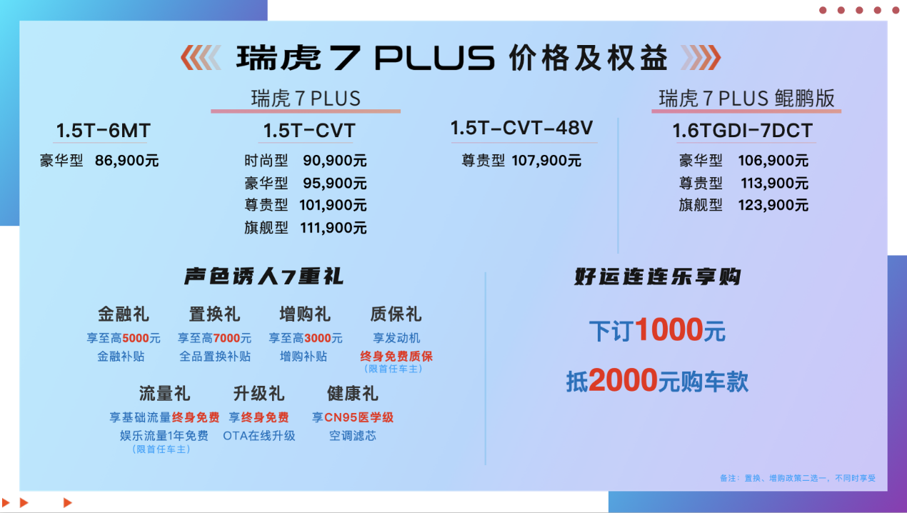宠粉狂魔又上线了!10月2日,瑞虎7 PLUS在郑州金秋大河国际车展隆重上市,宠粉价8.69万元-12.39万元,推出1.5T-CVT、1.5T-CVT-48V瑞虎7 PLUS及1.6TGDI-7DCT瑞虎7 PLUS鲲鹏版等9款车型,助力奇瑞再掀年轻风暴。除了宠粉价,瑞虎7 PLUS还带来了“声色诱人7重礼”宠粉福利,包括金融礼、置换礼、增购礼、质保礼、流量礼、升级礼、健康礼。此外还有“好运连连乐享购”下订1000元可抵2000元购车款。多重礼遇引发新一代年轻消费者福利大狂欢。