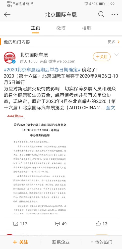 为应对新冠肺炎疫情的影响,切实保障参展人员和观众的身体健康和生命安全,经审慎考虑并与有关单位协商,现决定,原定于2020年4月在北京举办的2020(第十六届)北京国际汽车展览会(AUTO CHINA 2020)将延期至2020年9月26日-10月5日在北京中国国际展览中心新、老展馆举行,设在中国国际展览中心老馆的国内外零部件和新能源汽车展区的举办时间是2020年9月28日-9月30日。