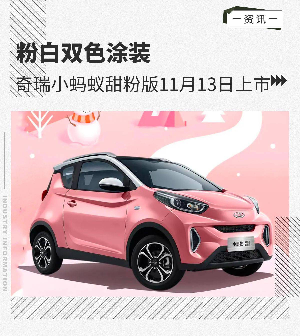 日前,网通社从官方获悉,奇瑞小蚂蚁甜粉版将于11月13日上市,新车针对外观及内饰做出调整,采用粉白双色涂装。动力部分,小蚂蚁甜粉版采用最大功率30kW永磁同步电机,提供301km和408km两种续航。