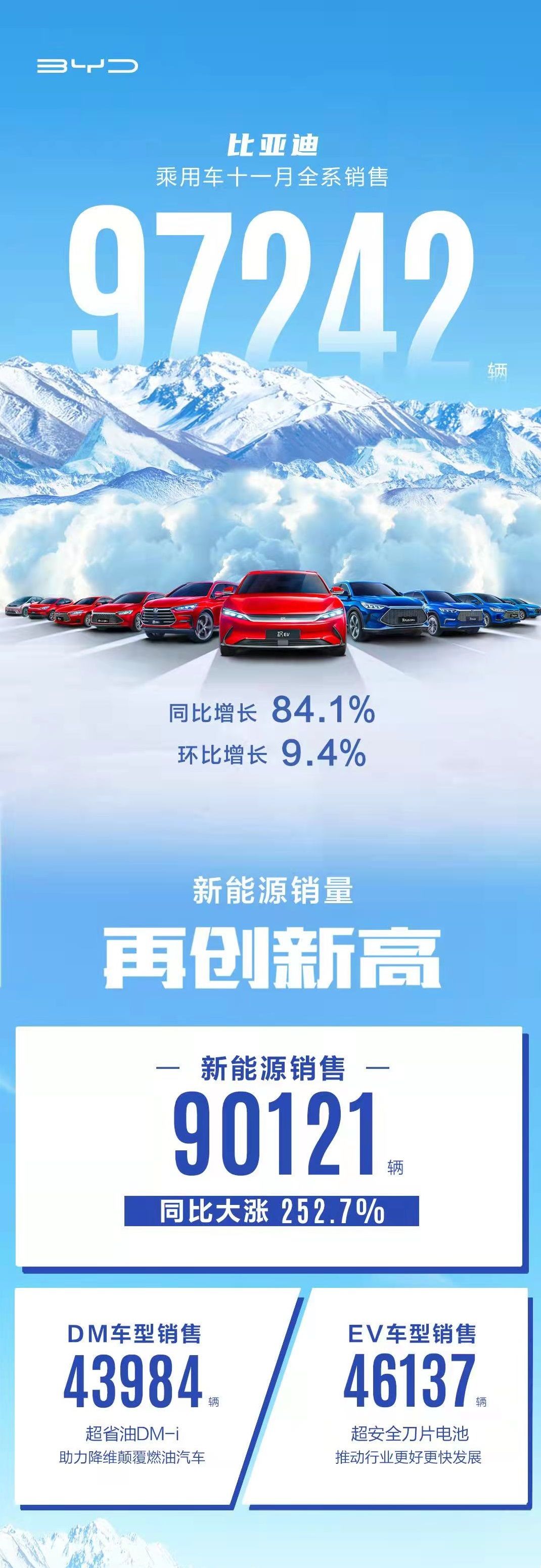 12月3日,比亚迪发布旗下乘用车11月销量快报。报告显示,当月比亚迪乘用车全系销售97242辆,同比增长84.1%。其中,新能源销量同比暴涨252.7%、达90121。这也是截止至目前的中国新能源乘用车月销新纪录,至此,比亚迪2021年度累计销量达500922。