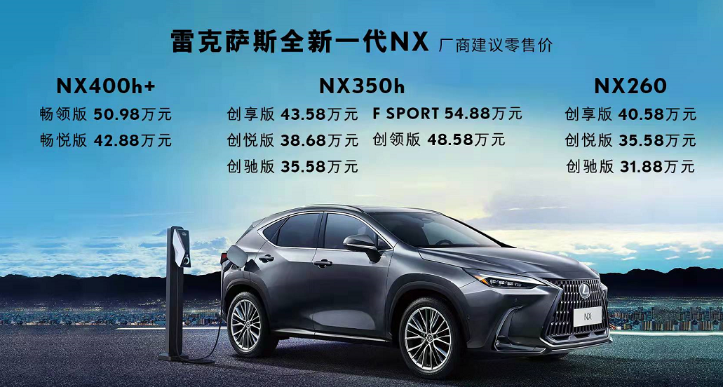 新车提供三种动力选择,包含燃油车型NX260、混合动力车型NX350h、以及插电式混合动力车型NX400h+,共十款配置,其厂方指导价区间为31.88-54.88万元。
