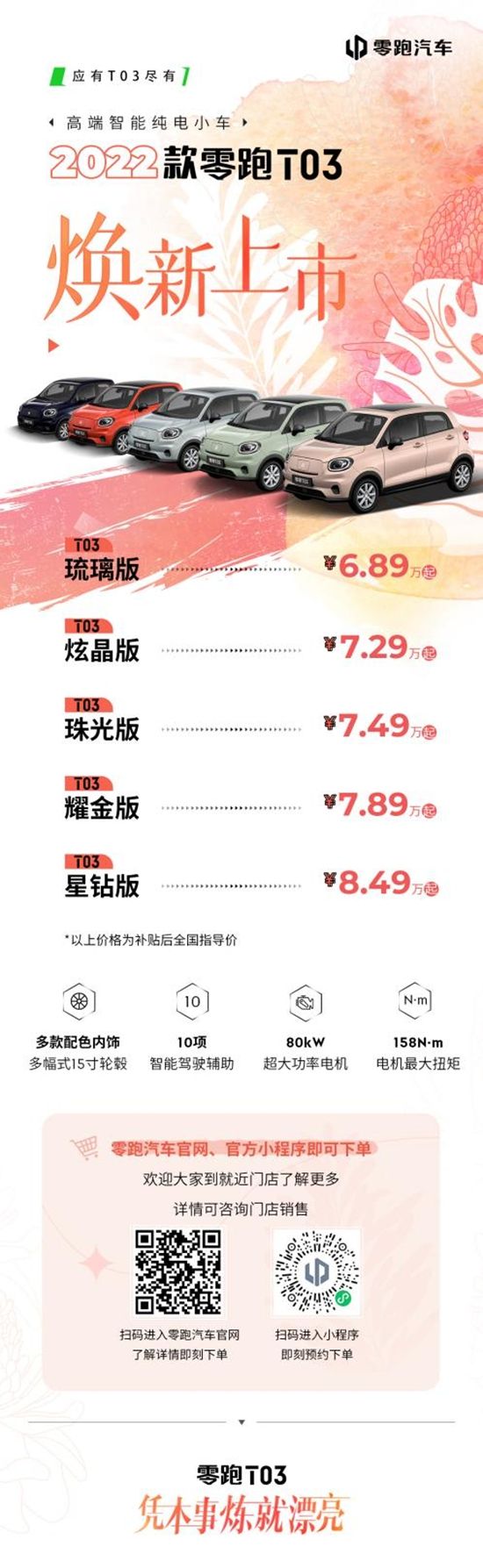 【凹凸汽车网 讯】郑州,2022款零跑T03正式上市。新车共计发布5个版本车型,琉璃版、炫晶版、珠光版、耀金版、星钻版,售价区间6.89-8.49万,车型阵容丰富,可供选择更多。