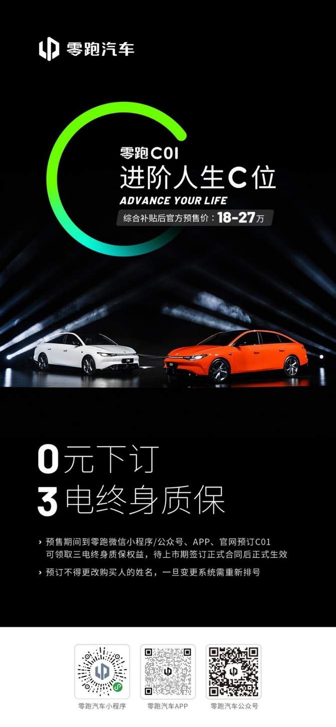 依托零跑全域自研技术优势,C01以硬核产品力重塑价值规则,预售政策也颠覆一切套路和限制所有期待实现人生进阶的用户,都可享受C01“0元预定”权利。从预售发布当天到C01上市期间,意向用户通过零跑汽车APP、官网、微信小程序或微信公众号,即可进行预定。预定订单顺序即为用户拿到同款车型、颜色车的顺序。同时,按照C01上市日公布政策,签订正式的预售合同,即可享有三电终身质保权益。为确保用户权益,本次0元下定的订单不得更改上牌用户的名字,若有变更则会重新计入订单顺序。0元下定,既是给用户自由选择的权利,也彰显了零跑对产品品质的足够自信。