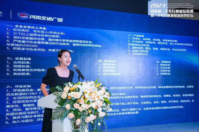 会上,河南省二手车流通协会秘书长尹柳柳公布了“河南省二手车诚信联盟商家”评选规则,评价分级、评判标准等。