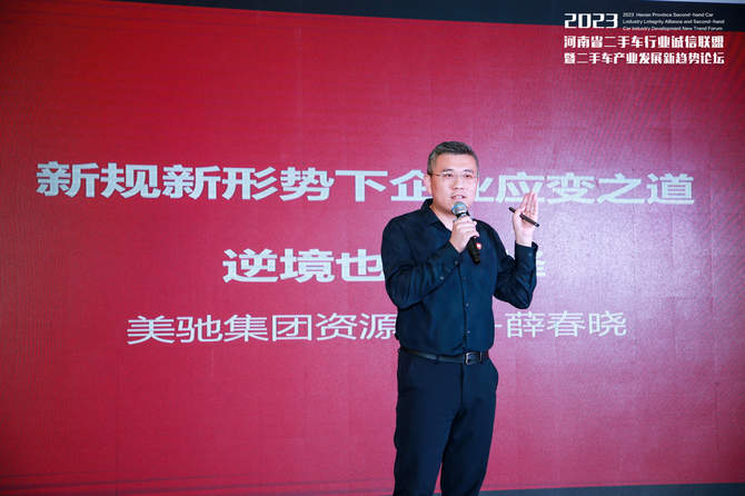 会议最后一项,由美驰名车资源中心总监薛春晓分享《新规新形势下,企业应变之道,逆境也有选择》主题演讲。