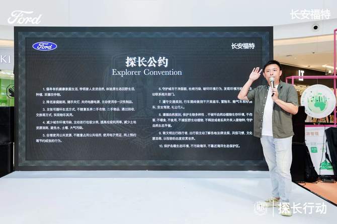 每一位探险者车主在成为探长时都需要签署《探长公约》。作为一份自律公约,福特探险者与每一位探长约定不随意丢弃垃圾并主动将垃圾带离景区或自然保护区、爱护动物且不得向野生动物投食、不在水源保护区洗车或清除车上污染物等九条生态保护的践行承诺。