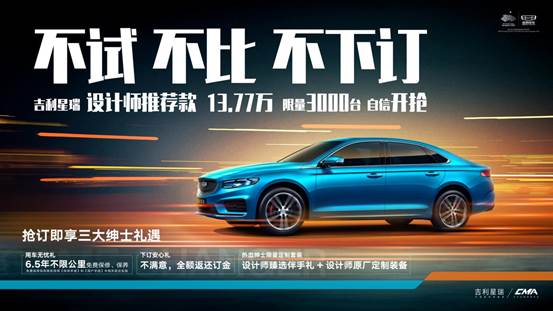 所有参与此次抢购活动的用户必须完成三个步骤:首先,必须前往当地吉利星瑞授权经销商门店,完成星瑞试驾体验;其次,必须与合资明星家轿对比体验,才能在经销商处获取星瑞设计师推荐款的抢购码;最后,凭借抢购码,可在吉利汽车官方蓝色商城支付订金,完成抢购。