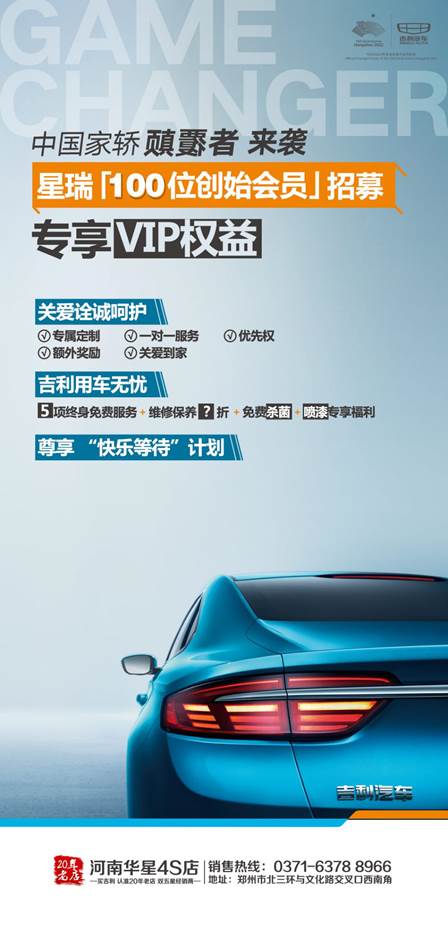 河南华星作为吉利汽车20年老店,现已推出【星瑞百位创始会员招募】活动,前100位华星星瑞车主可享5大关爱诠诚呵护与8项用车无忧服务,买车用车全程无忧。有意向了解的小伙伴快快去对比试驾品鉴吧!